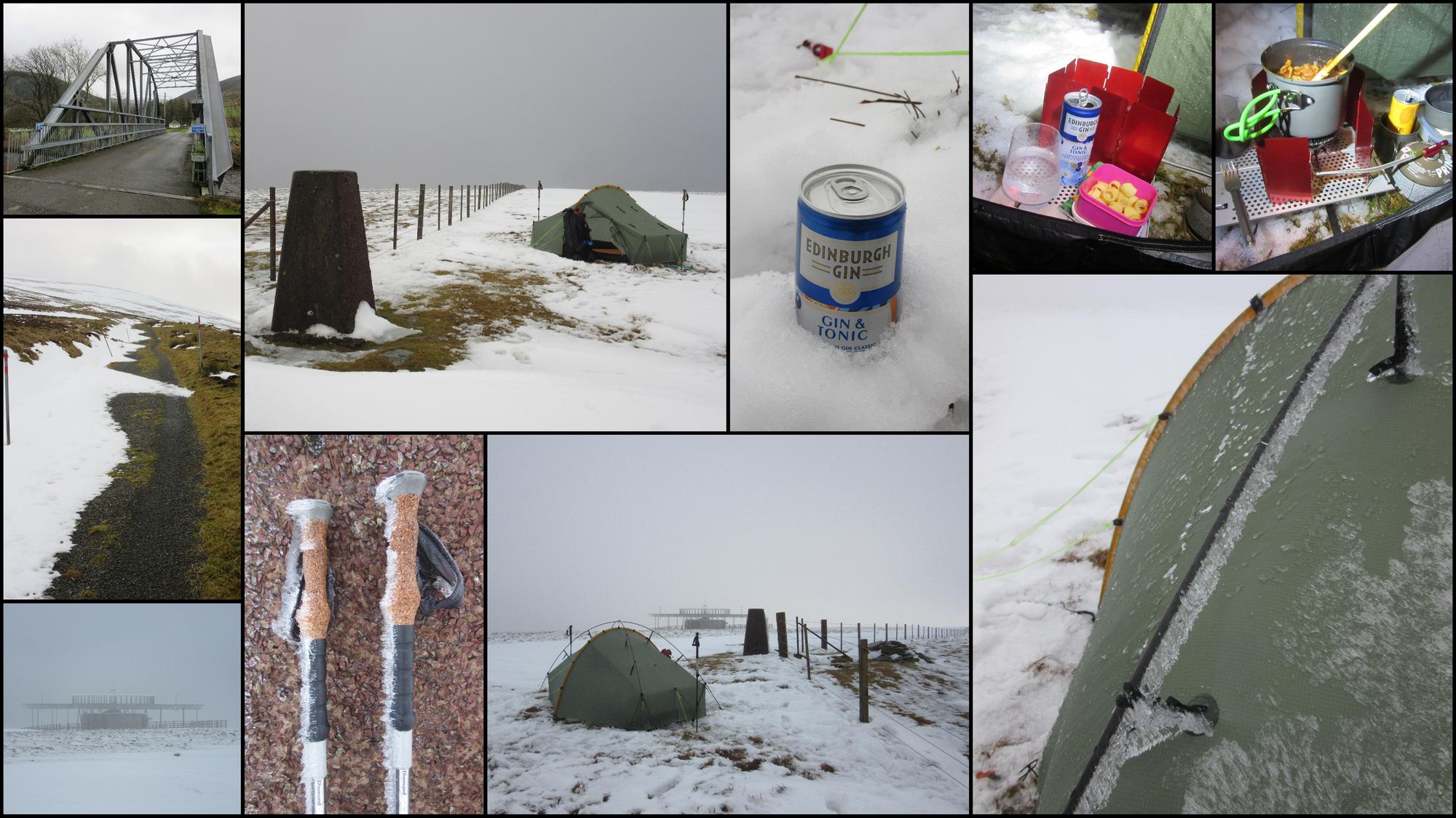 An easy one for a quick snowy hit during a brief weather window: 101 bus to Biggar, 91 to Thankerton (there's a stop through the village just across the road from the Tinto Hill Tea Room cafe) and then not much over an hour's walk to the top. Good flat grassy pitching near the trig point. Met office forecast for the hill was predicting a minimum of -7C overnight; I was glad I bought two sleeping bags up! Back down the same way in the morning, good breakfast in the cafe (opens 9:00, but closed Wednesdays).