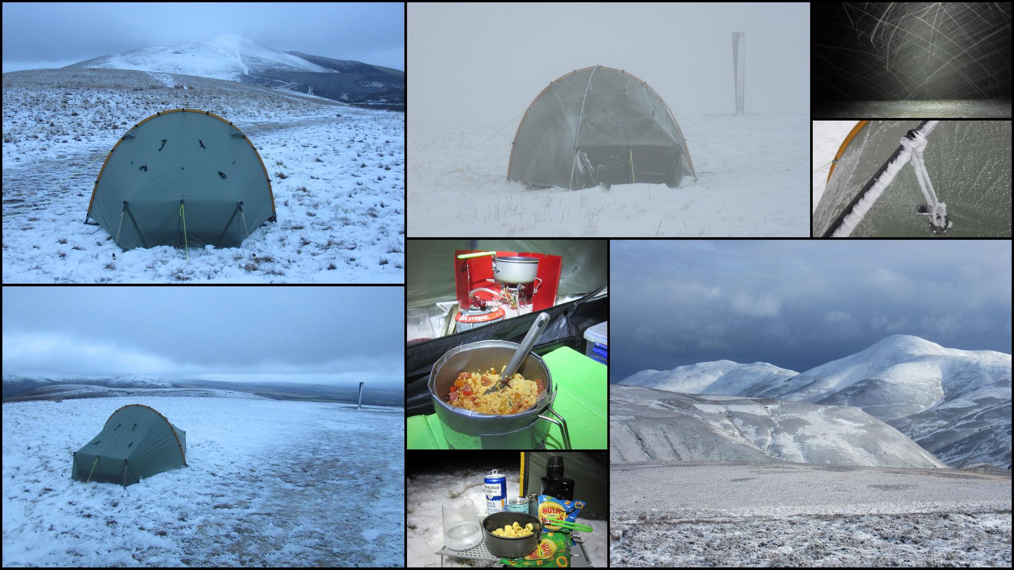 Another one night hit between gales. Despite the light winds, it was not going to be dry so I headed for Broad Law (840m), the highest thing within an hour's drive of Edinburgh in the hope any rain would fall as snow. What precipitation there was seemed to be mainly sleet, and some icy accumulations built up against poles and guy-lines.